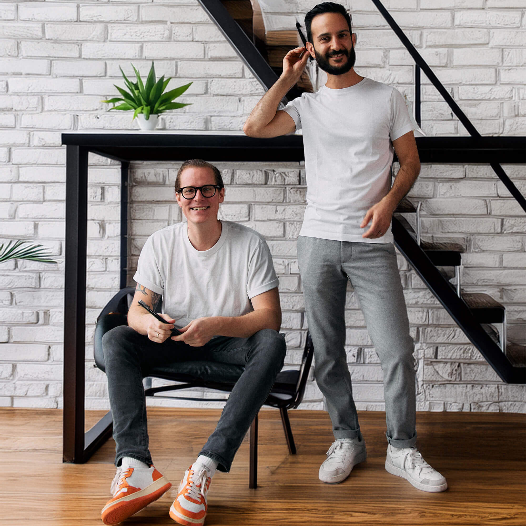 mate ist ein Düsseldorfer Dentalunternehmen für hochwertige und effektive Zahnpflege. Eine enge Zusammenarbeit mit Zahnärzten und Dentalhygienikerinnen garantiert unsere beste Qualität. Für saubere Zähne, gesundes Zahnfleisch und Stil im Badezimmer. (Foto: Die mate Gründer Damian und Mert)